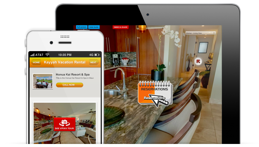 It's a mash up of VPiX® and Kayyah rolled into one. Now any vacation rental can insert a reservation / booking engine INSIDE the virtual tour. As in this example for the Honua Kai in Hawaii. Click the RESERVATION icon and book your room. It's a Kayyah exclusive and its available to any luxury vacation rental, resort, hotel, property management company or bed and breakfast with Kayyah version 2. Contact us today for a FREE Demo.